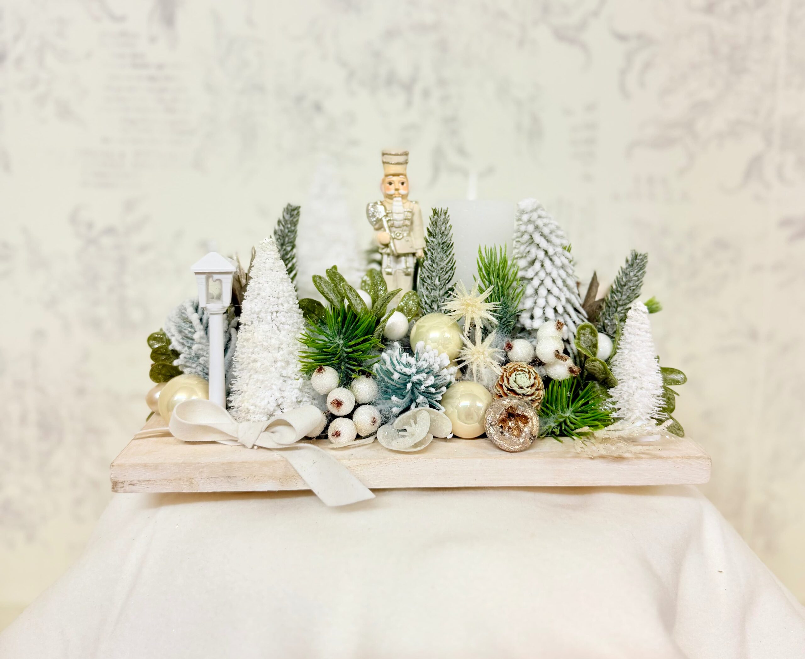 Piesa centrală este soldățelul Spărgător de Nuci, simbol clasic al sărbătorilor, care adaugă un aer de poveste și tradiție întregii compoziții.