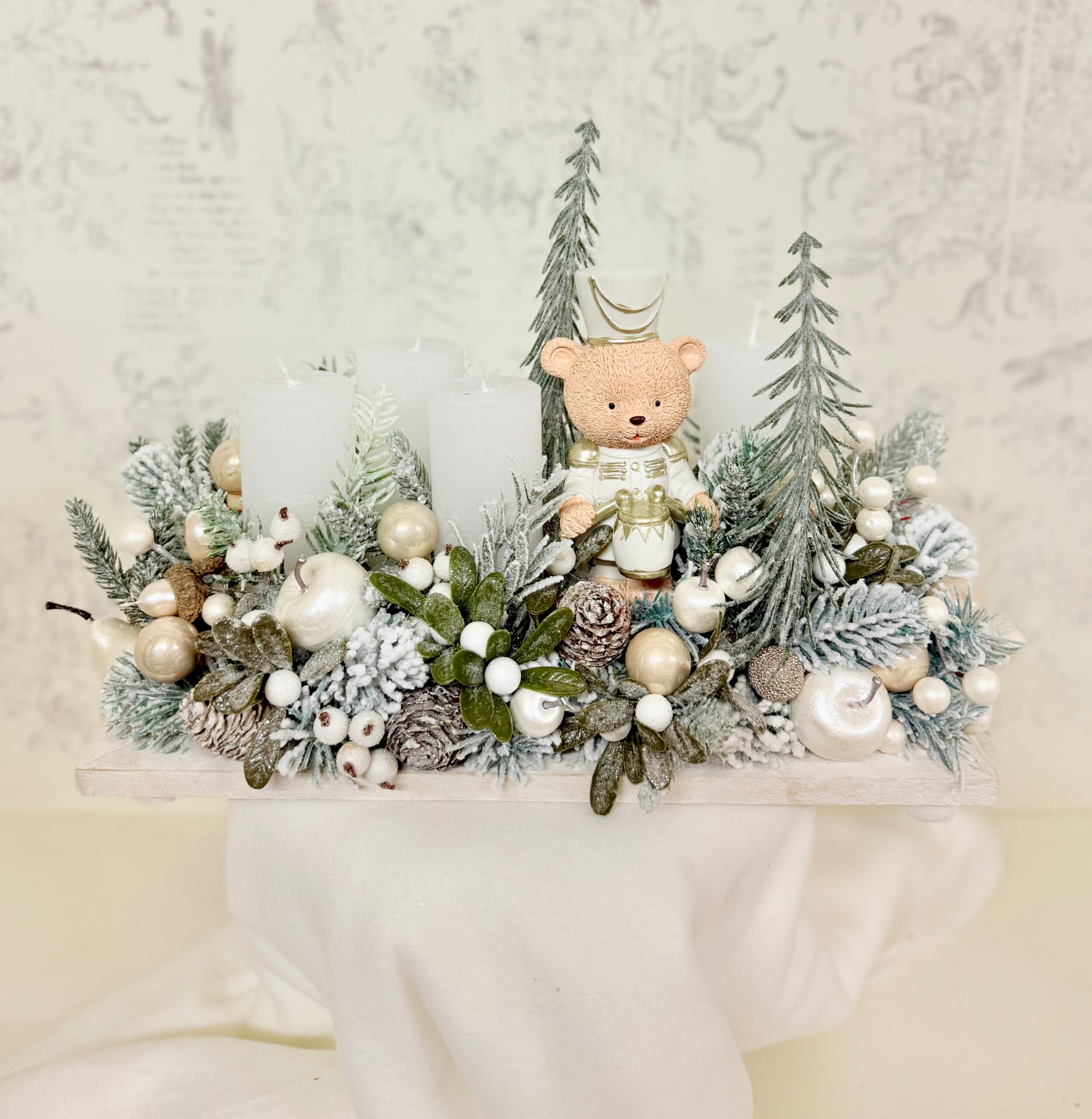 Elementul care dă viață întregului aranjament este ursulețul toboșar, decorat în alb și auriu, ce pare desprins dintr-o mini scenă de Crăciun din mijlocul pădurii. În jurul lui, cele 4 lumânări în tonuri neutre adaugă o lumină caldă și blândă, perfectă pentru serile liniștite de sărbătoare.