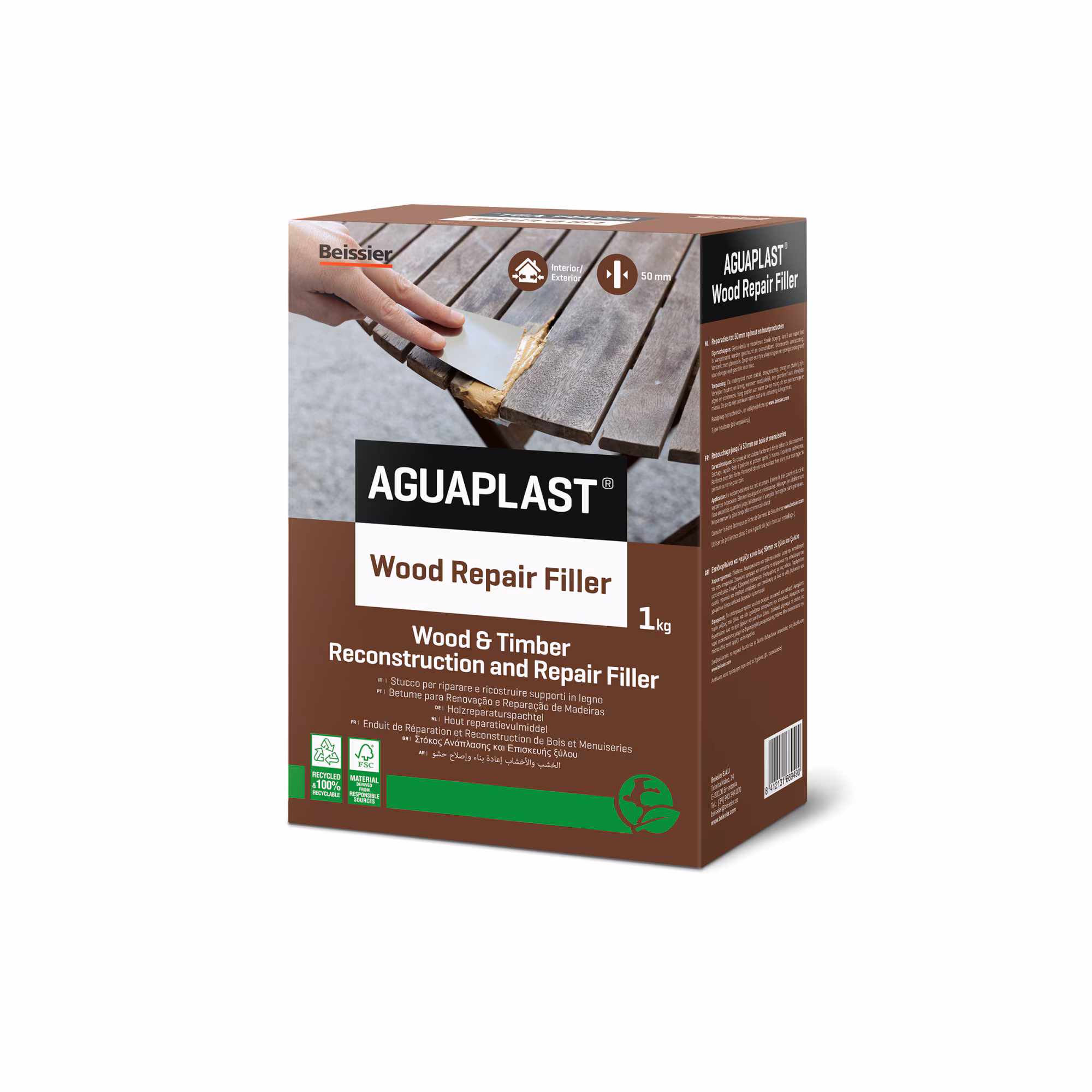 Produsul este întărit cu fibre pentru o rezistență mai mare și oferă o aderență excelentă pe suprafețele din lemn. Poate fi aplicat atât la interior, cât și la exterior și permite repararea defectelor de până la 50 mm adâncime. După uscare, suprafața poate fi șlefuită și finisată cu vopsea sau lac pentru lemn.